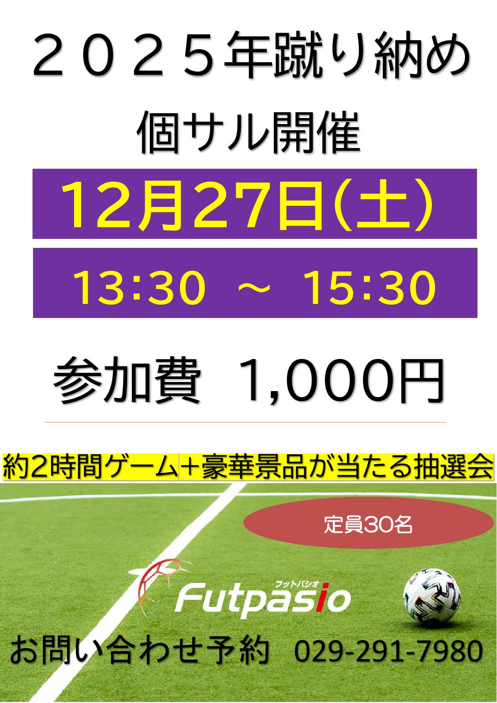 2025.11.19 2025年 年末蹴り納め個サル開催のお知らせ 毎年恒例蹴り納めイベント開催いたします! 豪華賞品が当たる大抽選会もありますので是非ご参加ください! Tweet Share Hatena Pocket RSS feedly Pin it お正月コートレンタルキャンペーン開催のお知らせ 前の記事 年末年始営業時間について 次の記事